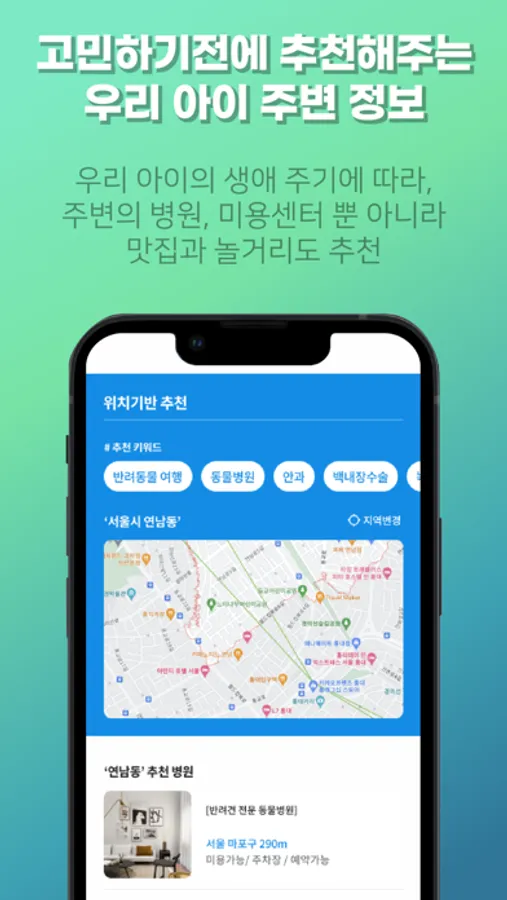 우리 아이의 생애 주기에 따라, 주변의 병원, 놀이터, 미용 센터 등 과 보험을 추천해 드립니다.
