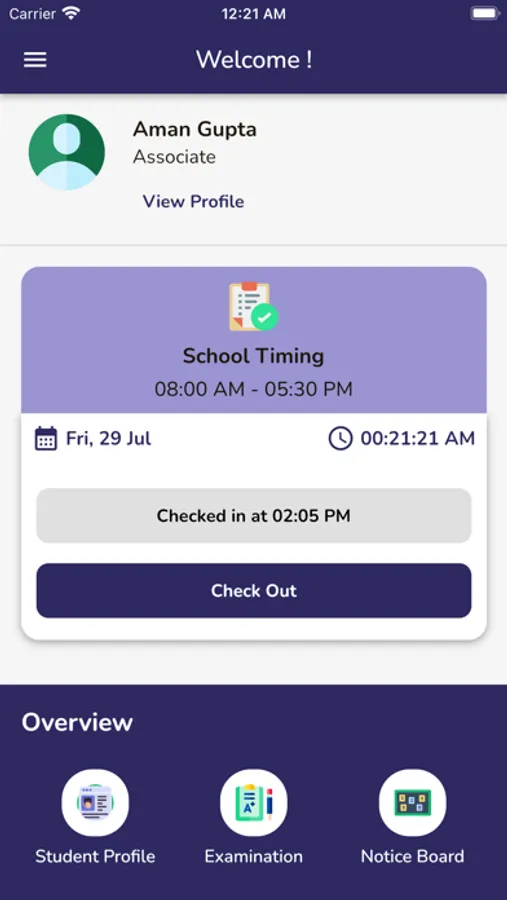 Teachers can easily mark their attendance just by clicking on the Check-in and track their attendance monthly-wise.