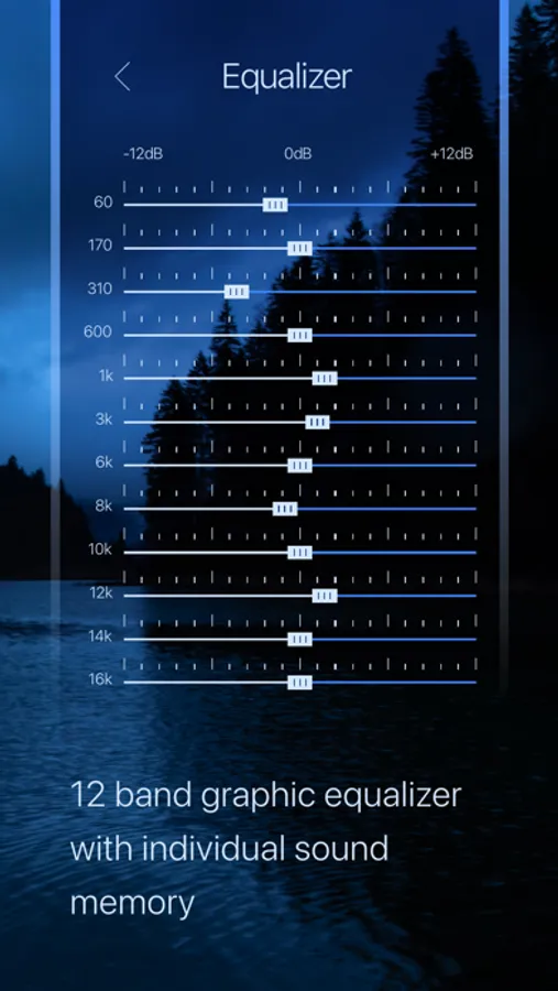 - A unique 12-band audio equalizer which allows you to tune the frequency of each sound on this app. This will allow you to customize the sound to better suit your particular tinnitus frequency with the goal of greater hearing comfort as you sleep and relax.