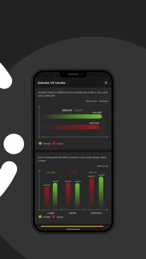Entrate Vs Uscite, dove puoi visualizzare il confronto del saldo del mese corrente e degli ultimi 2 e 3 mesi;