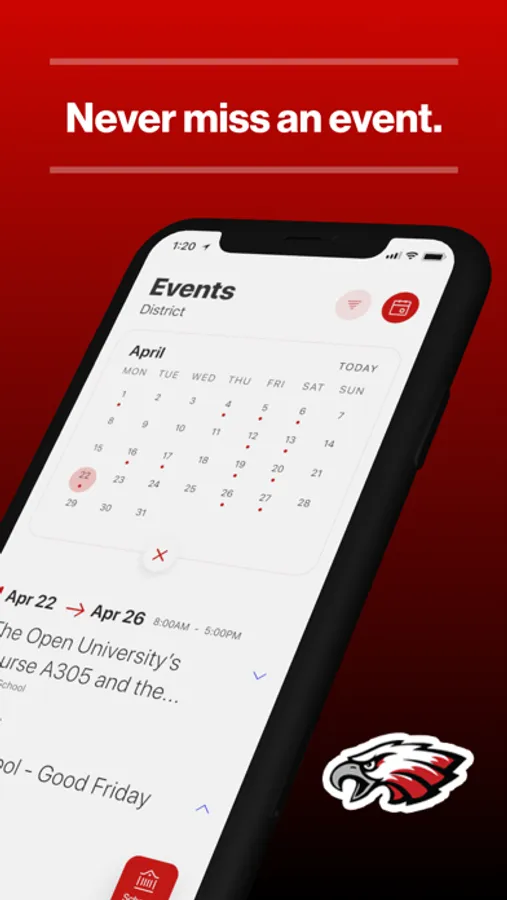 The event section shows a list of events throughout the district. Users can add an event to their calendar to share the event with friends and family with one tap.