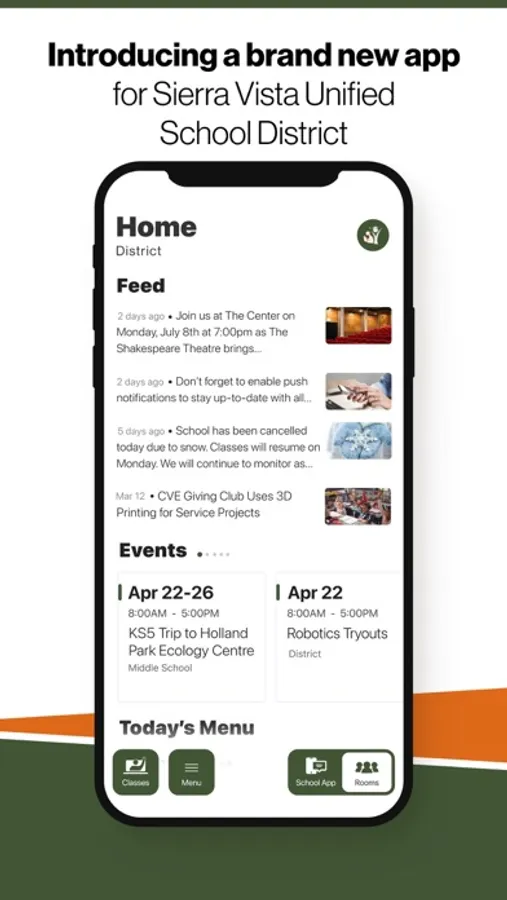 The event section shows a list of events throughout the district. Users can add an event to their calendar to share the event with friends and family with one tap.