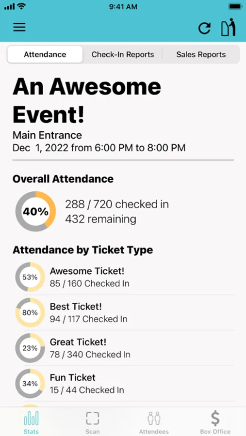 - Real time view of the check-in progress for your event