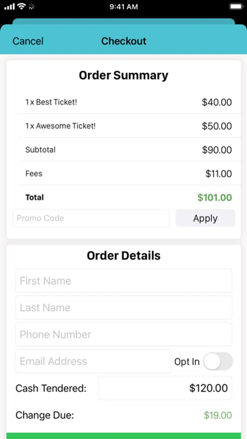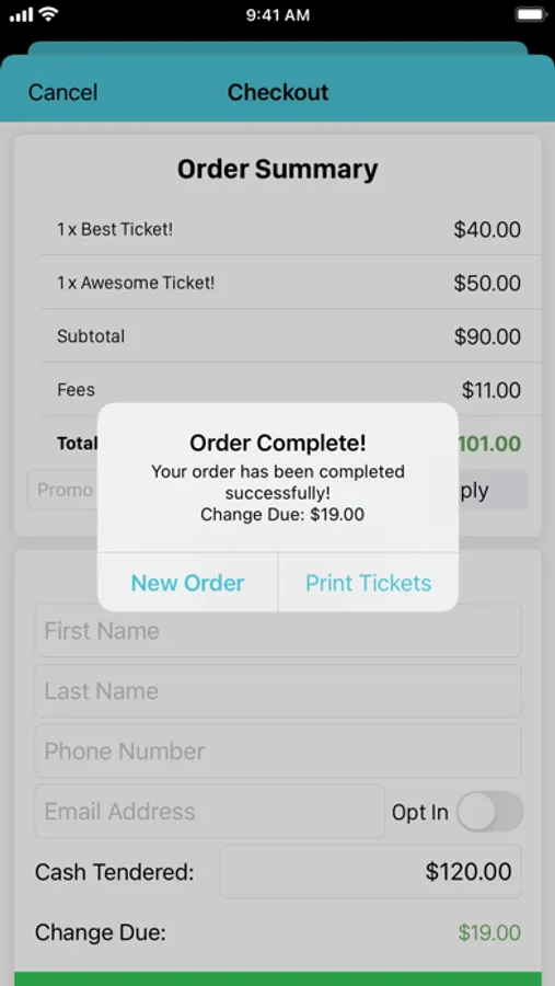 - Create orders and accept cash or credit cards