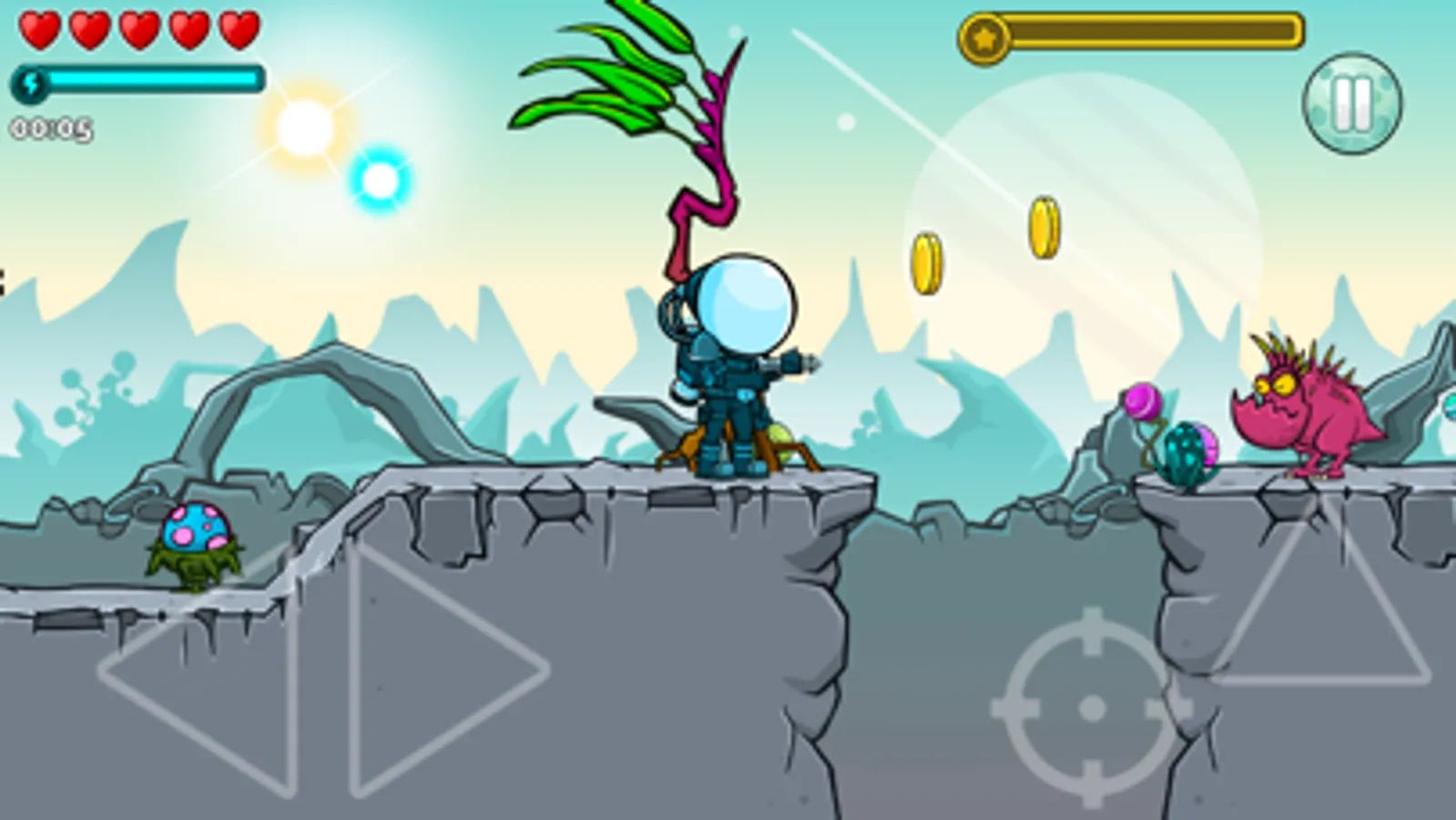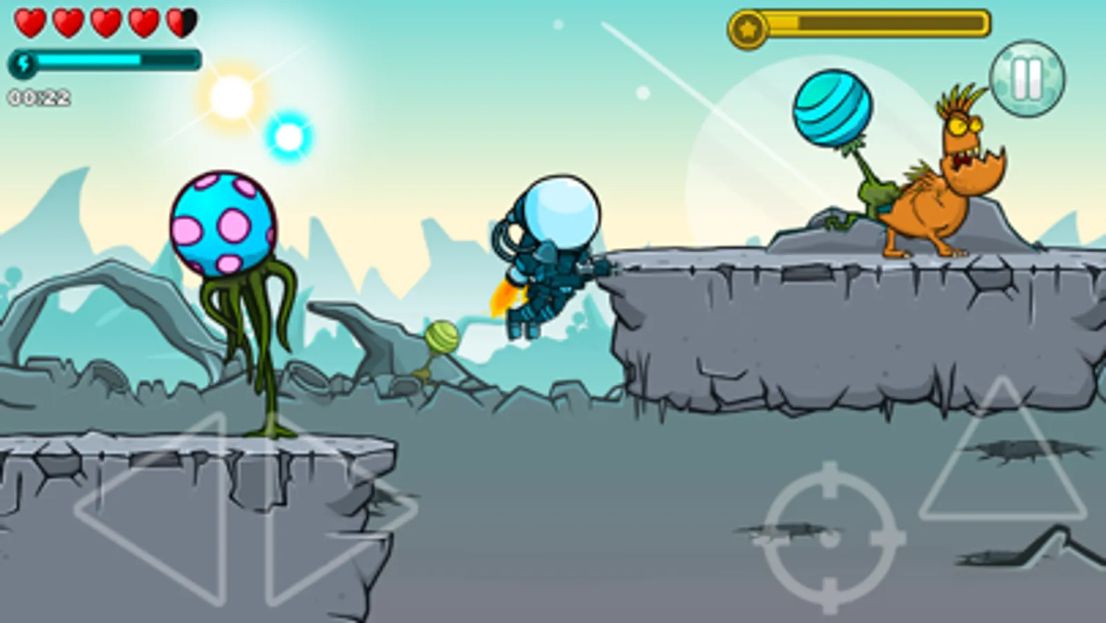 Find the best way to complete the levels. Cosmonaft flies over abysses and cliffs. Fly up like a rocket, shoot at the evil aliens, fall like a stone and start over again.