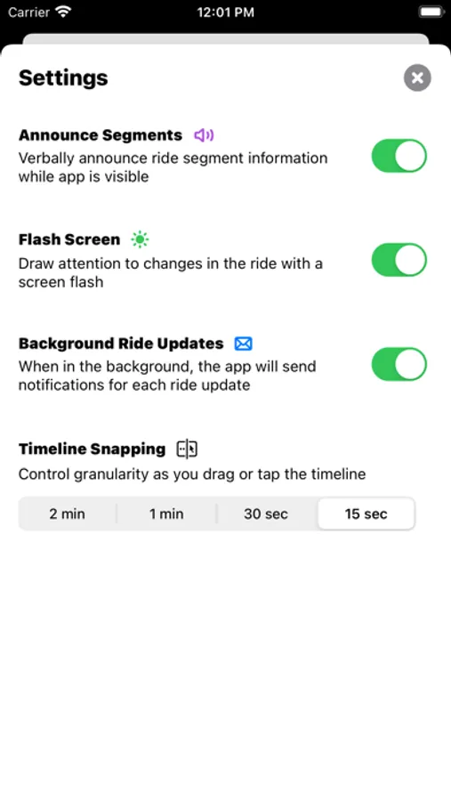 - Stay aware of your ride by optionally having the app announce ride segment data verbally, and/or flash screen or use local background notifications