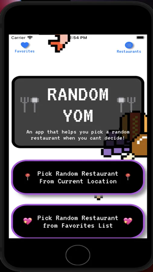 A simple app for all of my indecisive foodies!! If you have ever had trouble deciding what to eat, this app is for you. It picks a random restaurant that is near you, has 4+ stars on yelp, and is currently open! You can also add restaurants to a list of your favorite places and pick a random place from your favorites! YOM YOM