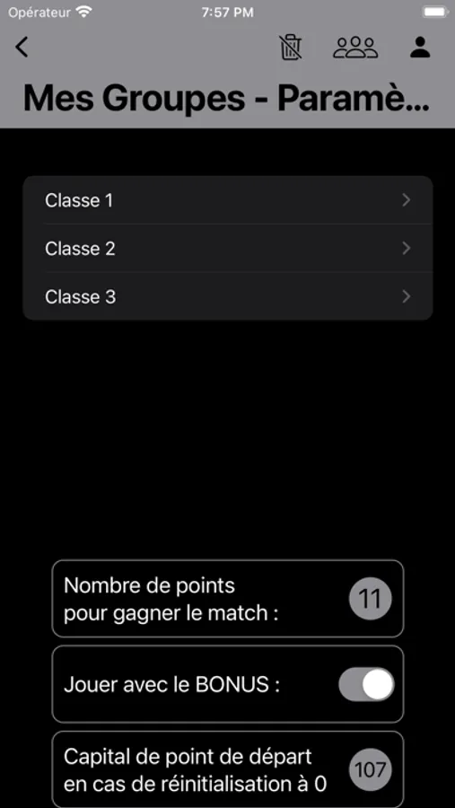 Le nombre de points pour remporter un match est personnalisable. Vous pouvez indiquer le résultat du match.
