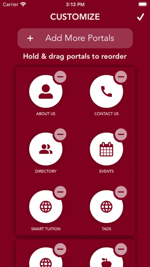 Your Guardian Angel app is fully customizable by you: Rearrange your portals to easily access whichever features you use most. If you want to check school events frequently, you can put that portal front and center. If you never check the directory, you can turn that portal off.