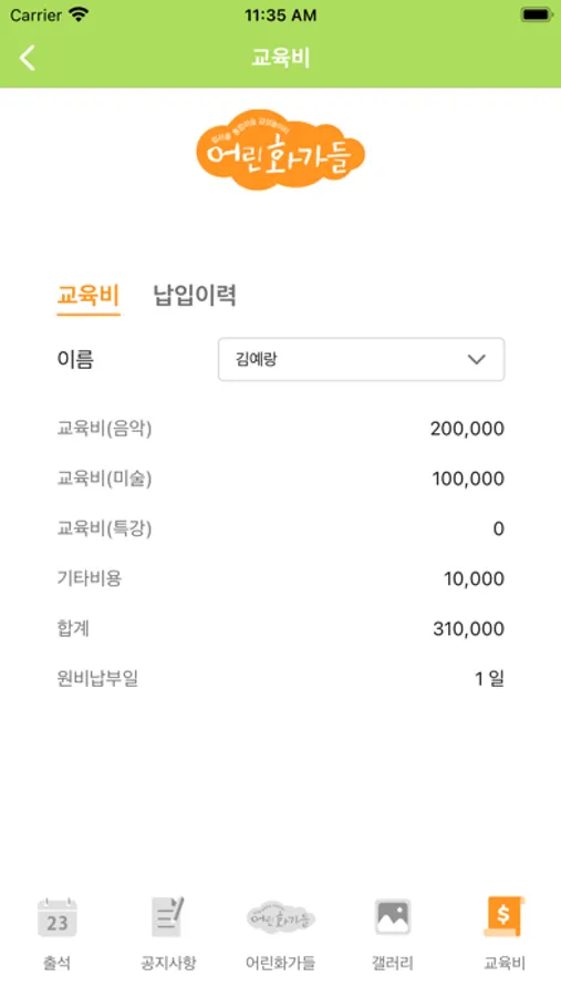 - 어린음악대 학원에 교육비 수납 내역을 모두 확인할 수 있습니다.