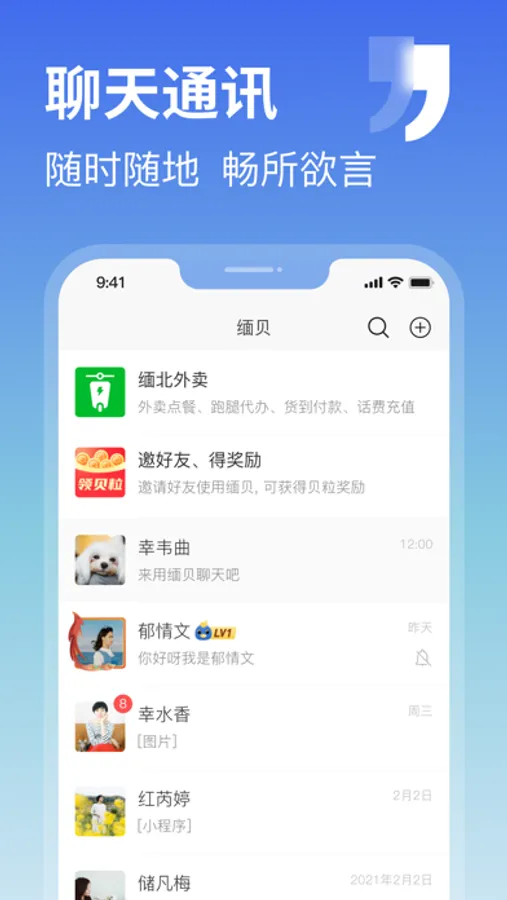 一个集短视频于一身的聊天类软件,完全的免费畅聊,可发送视频,语音,图片,您也可以在这里发布一些有趣的视频和朋友们分享你的快乐,同时在这里也能为您的生活提供便利,比如话费充值,点外卖等