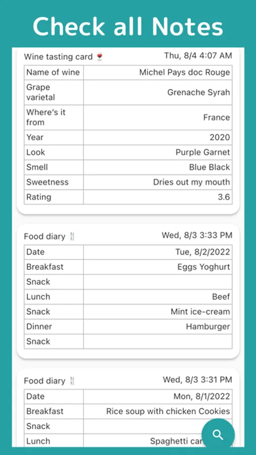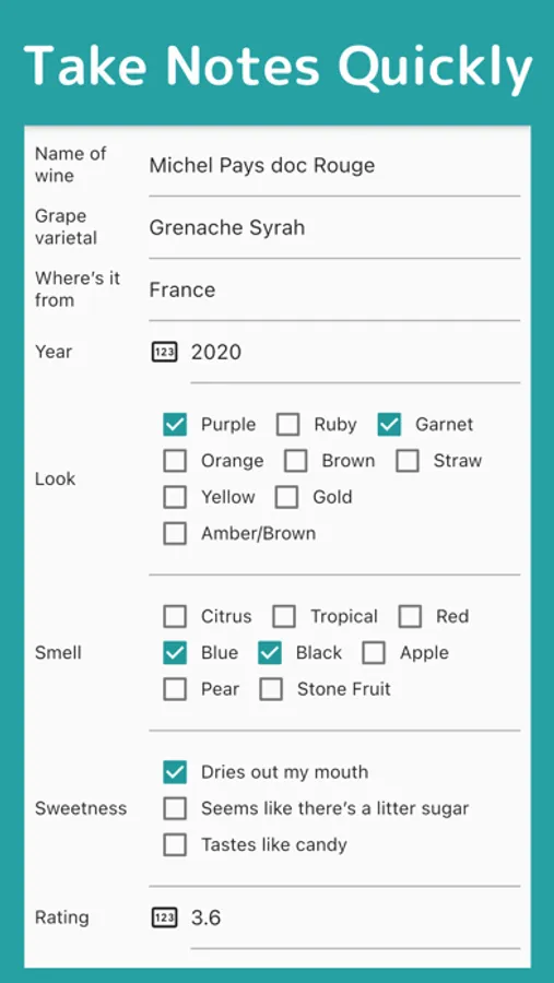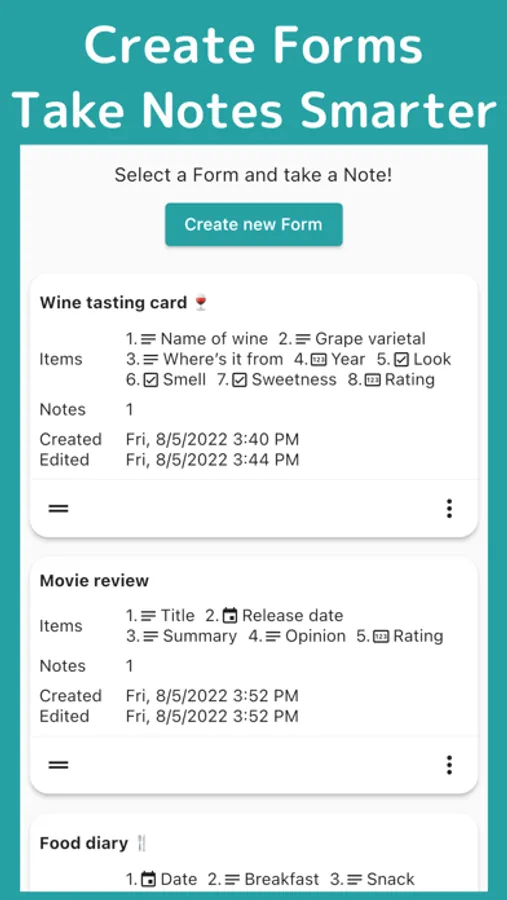 FormNote is a Note App that allows you to quickly and easily leave complex notes like some reviews, wine tasting notes and so on anywhere on your mobile.