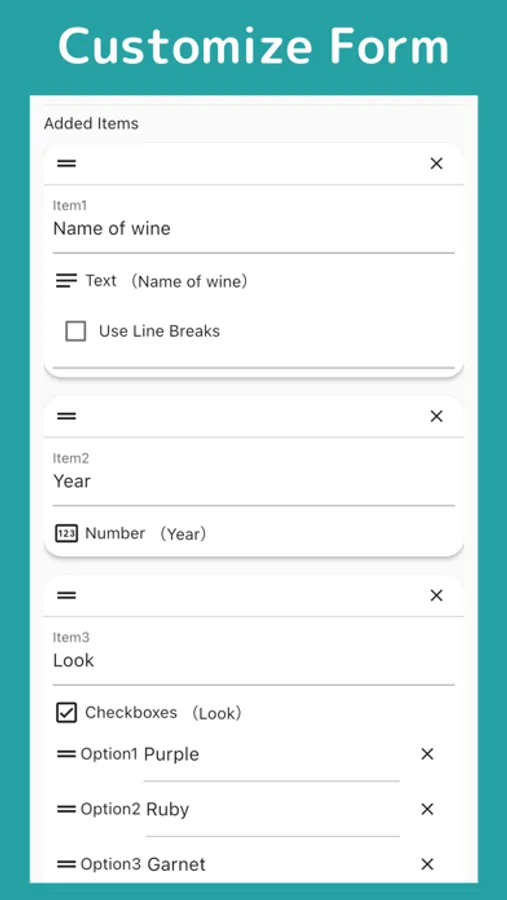 In addition to normal text input, you can also set up items specialized for smartphone input, such as numbers and dates, checkboxes and ratings (stars).