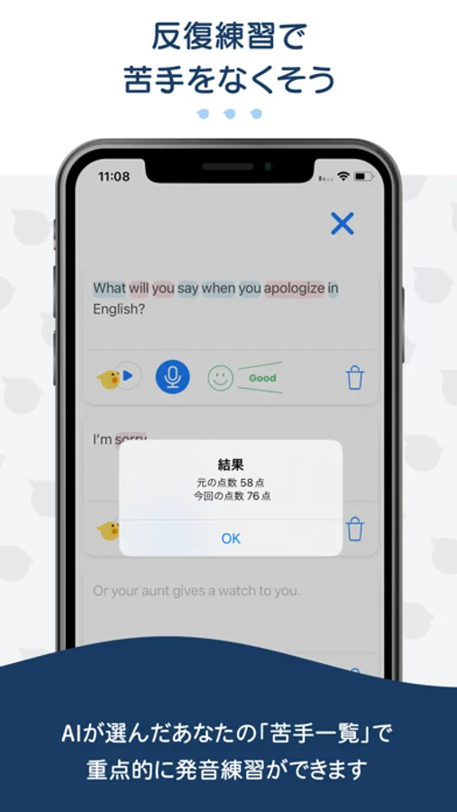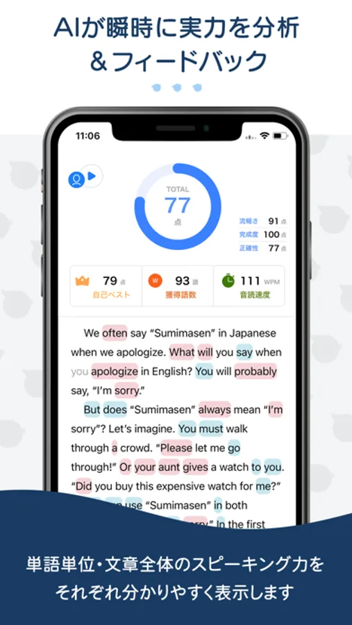 ・うまく発音できなかった単語や文章がハイライト表示され、何度でも復習できます。
