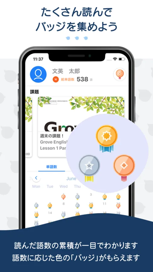 ・日々の発音単語数が記録化されて、グラフやバッジで可視化されます。