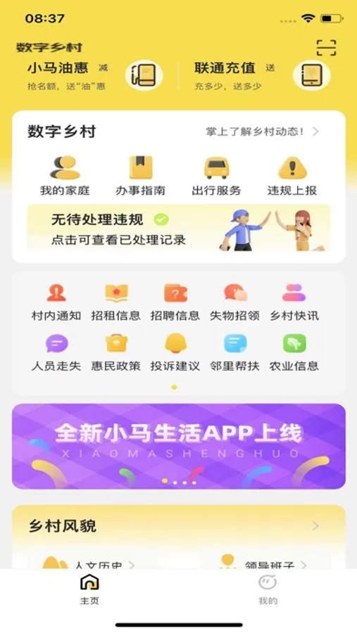 主要功能包括办事指南、违规上报、失物招领、求职招聘、党建引领、乡村风貌,村内通知,乡村快讯。惠民政策等。