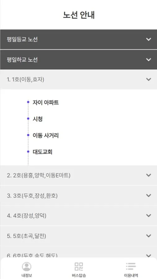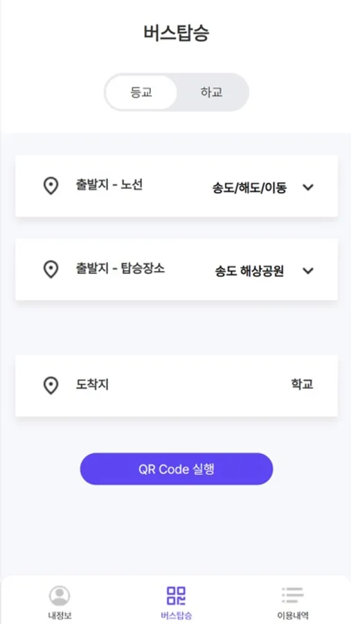 [버스탑승] 메뉴에서 노선을 선택한 후, QR코드를 실행시켜 버스에 탑승하실때 단말기에 인식해주세요.