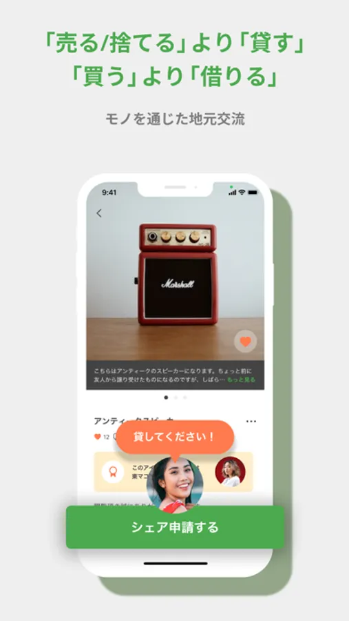 登録されたアイテムを借りたい場合は、事前に受け渡しの場所や借りたい条件をリクエストして、合意が得られてからの取引なので、安心安全で簡単。万一の紛失や盗難、破損には、自動で保険の対象となります。