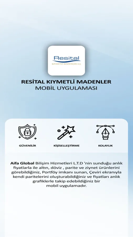 Aifa Global Bilişim Hizmetleri L.T.D 'nin sunduğu anlık fiyatlarla ile altın, döviz , parite ve ziynet ürünlerini görebildiğiniz , Pörtföy imkanı sunan, Çeviri ekranıyla kendi paritelerini oluşturabildiğiniz ve fiyatları anlık grafiklerle takip edebildiğiniz bir mobil uygulamadır.