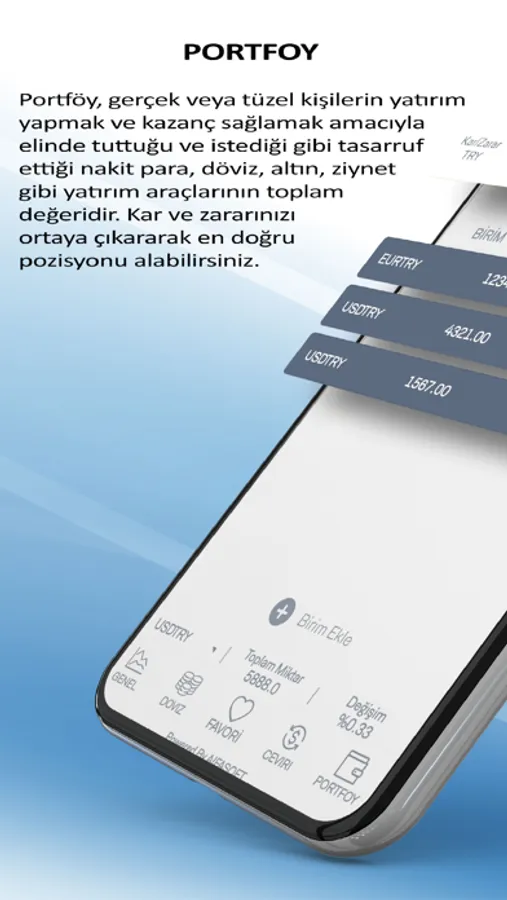 Portföy, gerçek veya tüzel kişilerin yatırım yapmak ve kazanç sağlamak amacıyla elinde tuttuğu ve istediği gibi tasarruf ettiği nakit para, döviz, altın, ziynet gibi yatırım araçlarının toplam değeridir. Kar ve zararınızı ortaya çıkararak en doğru pozisyonu alabilirsiniz.