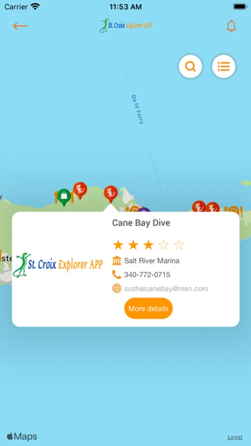 Like the map, the app contains accurate information about businesses and where they are located. Just scan the QR code displayed at the airport and posters throughout St. Croix, or from the St. Croix Explorer map magazine. Locations of businesses on the St. Croix Explorer app are updated frequently, so this app is great for when Google or Apple (other maps send you to Puerto Rico).