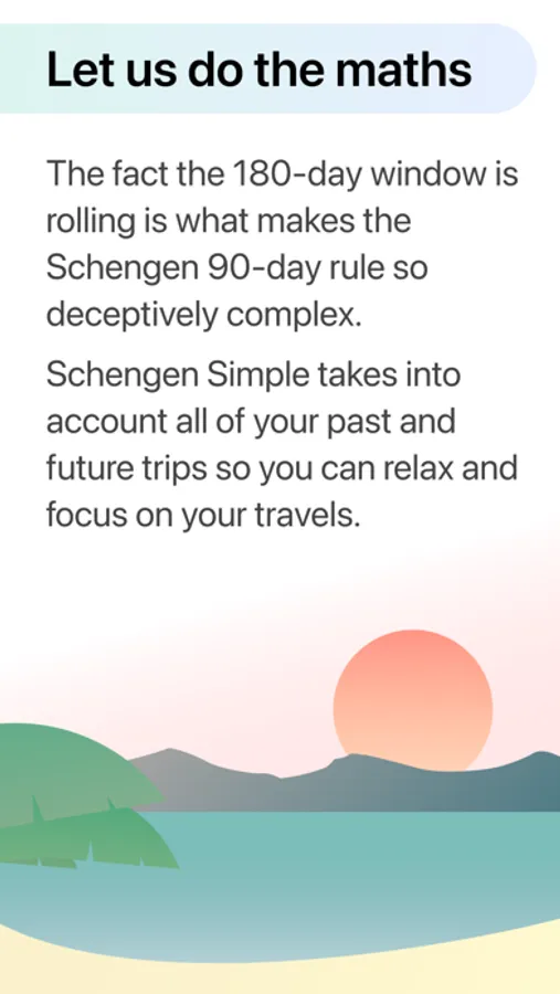 • No need to nominate a date of entry, Schengen Simple analyses all your past and future trips, instantly updating your allowance for your entire calendar. Making it fast, easy and accurate to plan your travels.