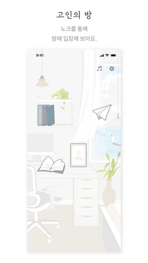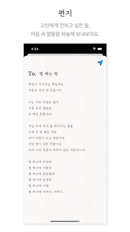 - 편지 : 종이비행기그림을 탭하여, 고인에게 전하고 싶거나 마음 속에 있는 감정과 이야기를 털어놓고 하늘에 날려보내요.