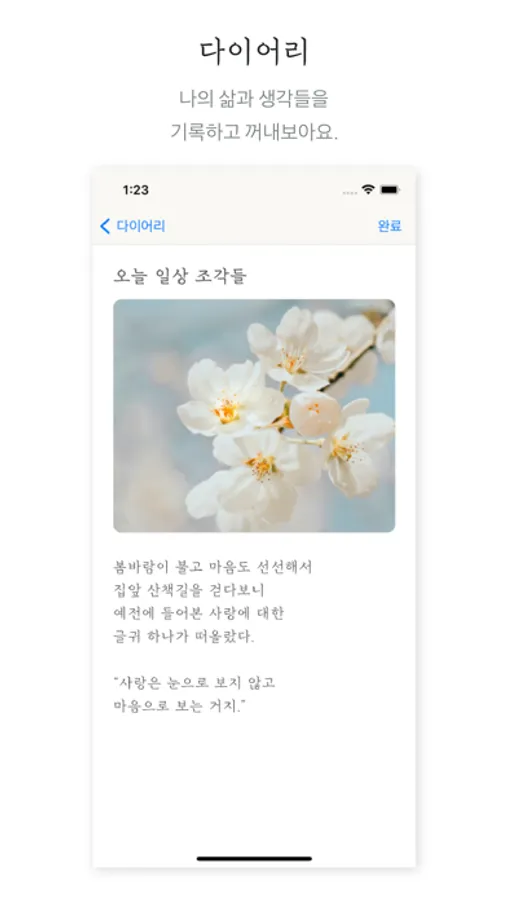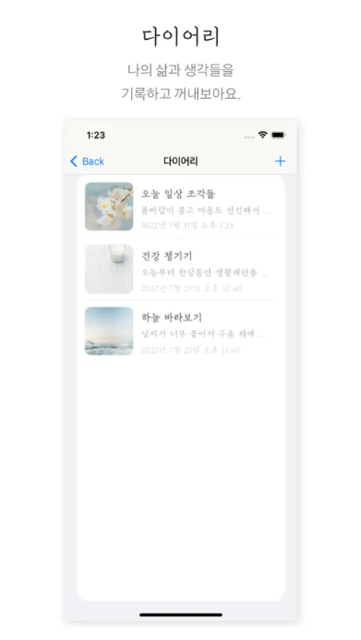 - 다이어리 : 일기장그림을 탭하여, 자신의 삶과 생각들을 자유롭게 기록하고 꺼내보아요.