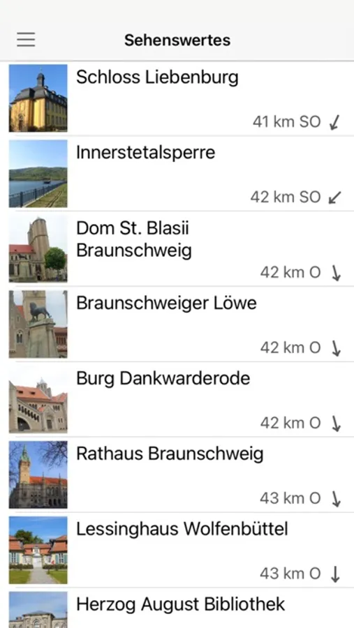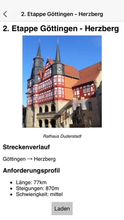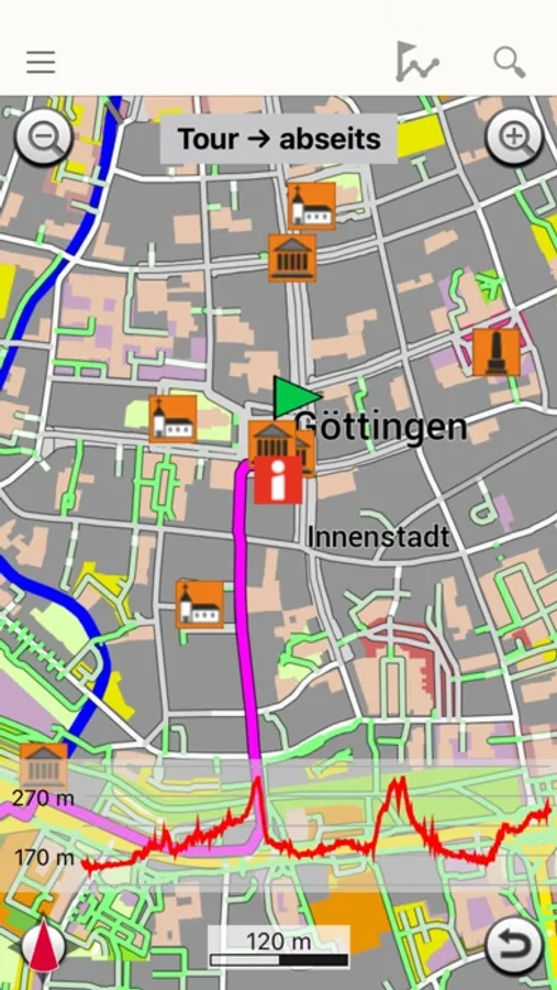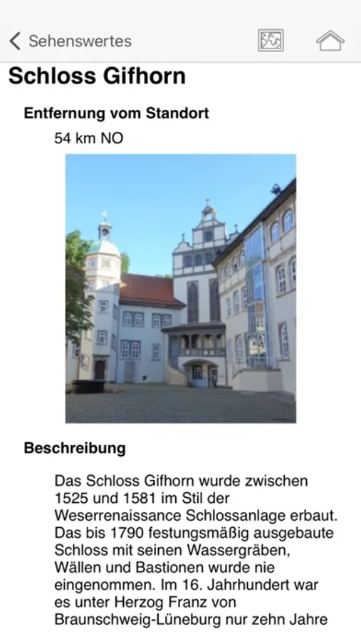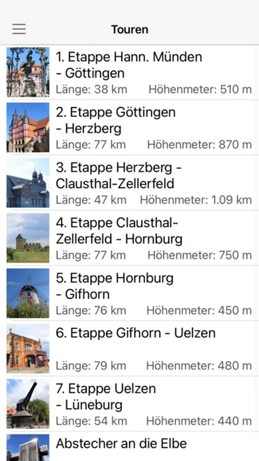 Im Hauptmenü finden Sie eine Liste besonderer Sehenswürdigkeiten, die nach Entfernung von Ihrem aktuellen Standort sortiert ist. Im Hauptmenü finden Sie auch eine Liste mit den 7 Etappen des Weser-Harz-Heide Radfernwegs und eine weitere Tour mit einem Abstecher an die Elbe. Die Tour-Beschreibung enthält Informationen wie Länge, Höhenmeter, Schwierigkeitsgrad und der Routenverlauf mit Hinweisen zu den POIs (interessante Orte) entlang der Route. Nach Aufruf der Tour wird der Verlauf in der Karte angezeigt und die Fahrradtour kann starten. Ihre Position wird dabei in der Karte ständig nachgeführt. Wie weit der Weg bis zum Ziel ist, wird durch die Restkilometeranzeige am oberen Bildschirmrand angezeigt. Wird die Route zum Beispiel durch falsches Abbiegen verlassen, ertönt ein Hinweiston. Sicher und entspannt am Ziel ankommen, ist so kein Problem.