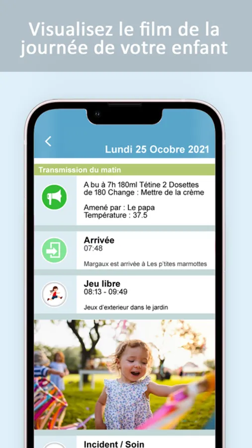 - Voir les transmissions journalières : un compte-rendu quotidien des événements marquants de la journée de leur enfant leur est envoyé quotidiennement
