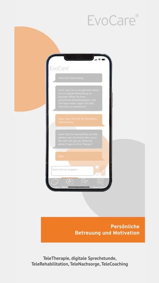 Die EvoCare-Patient-App verbindet Patient:innen mit ihrem HealthCare-Professional, mit ihrem Arzt:in und Therapeut:in. EvoCare-Patient-App ermöglicht es, die Beziehung und Begleitung von Patient:innen durch vertraute Arzt:in und Therapeut:in aufrecht zu erhalten.