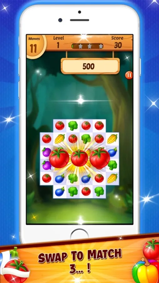 Swap to match 3 or more crops and create waves of excitement in this fun and juicy puzzle game. Harvest your garden farm with magical crops , make garden mania, super match 3. Swap and crush same color crops to clear your board.
