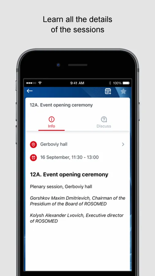 - create your own schedule and receive notifications about the beginning of the selected sessions;