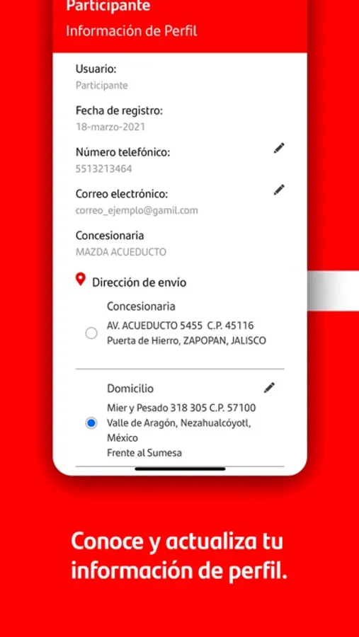 Perfil. En esta sección podrás actualizar tu dirección de entrega de premios y número telefónico para que siempre recibas tus premios a tiempo.