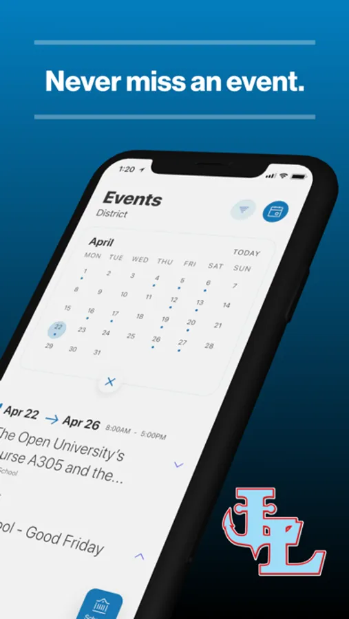 The event section shows a list of events throughout the district. Users can add an event to their calendar to share the event with friends and family with one tap.