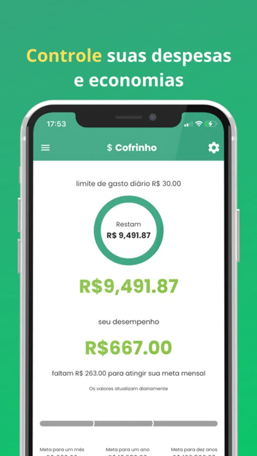 Para começar você deve definir seu limite da gasto diário, o app calcula automaticamente uma previsão mensal, anual e para dez anos