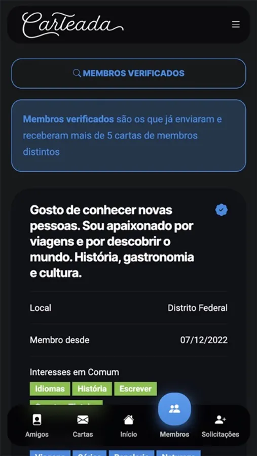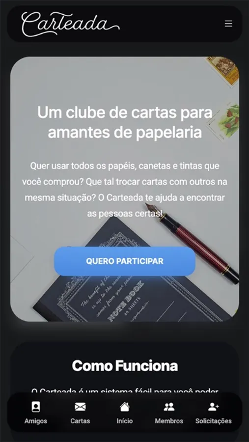O Carteada é um clube de cartas! Um clube de carta nada mais é que um grupo de pessoas que gostam de enviar cartas, escritas à mão. Como é muito mais divertido quando há respostas, o clube reúne pessoas dispostas a enviar e responder correspondências!