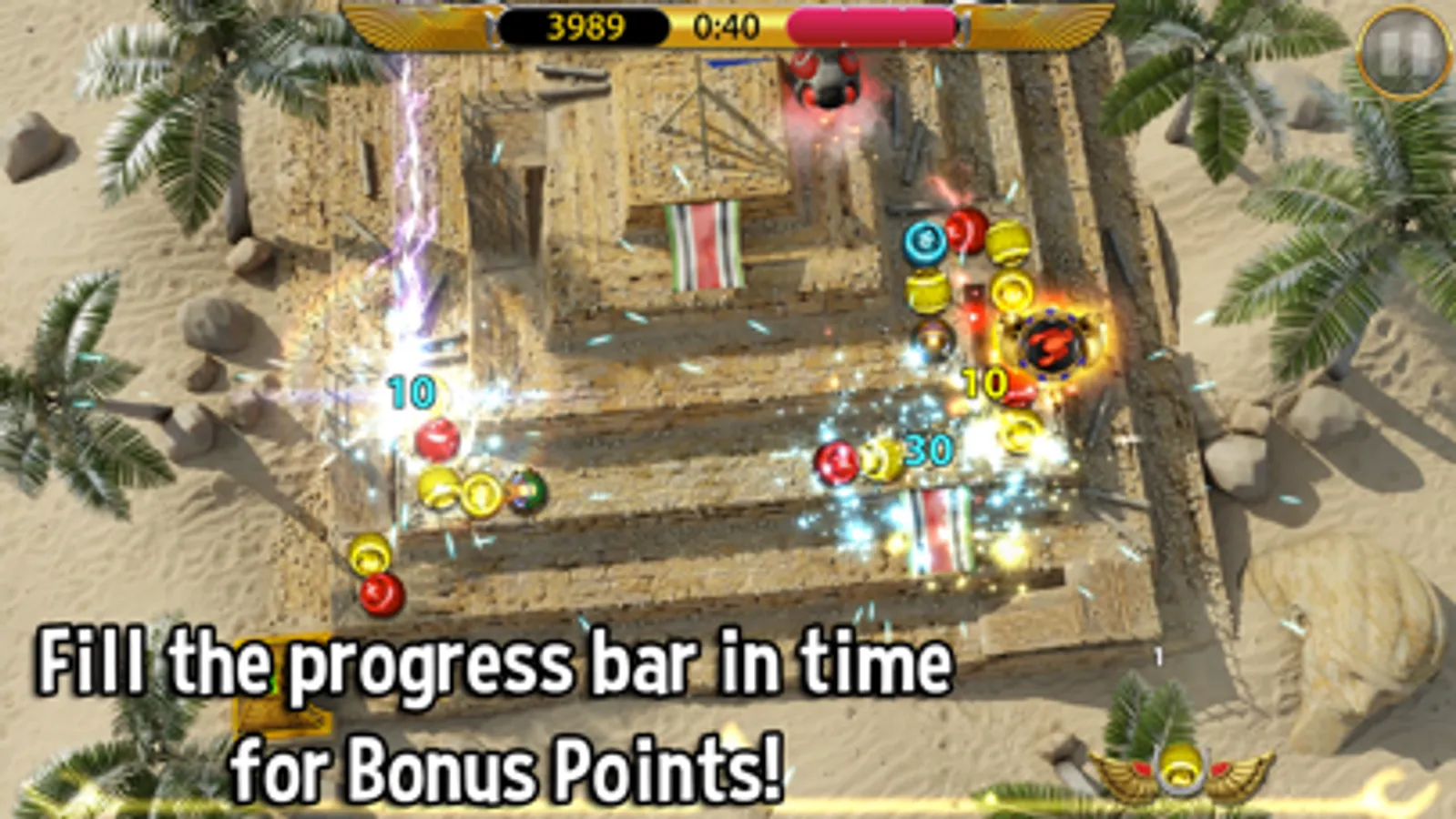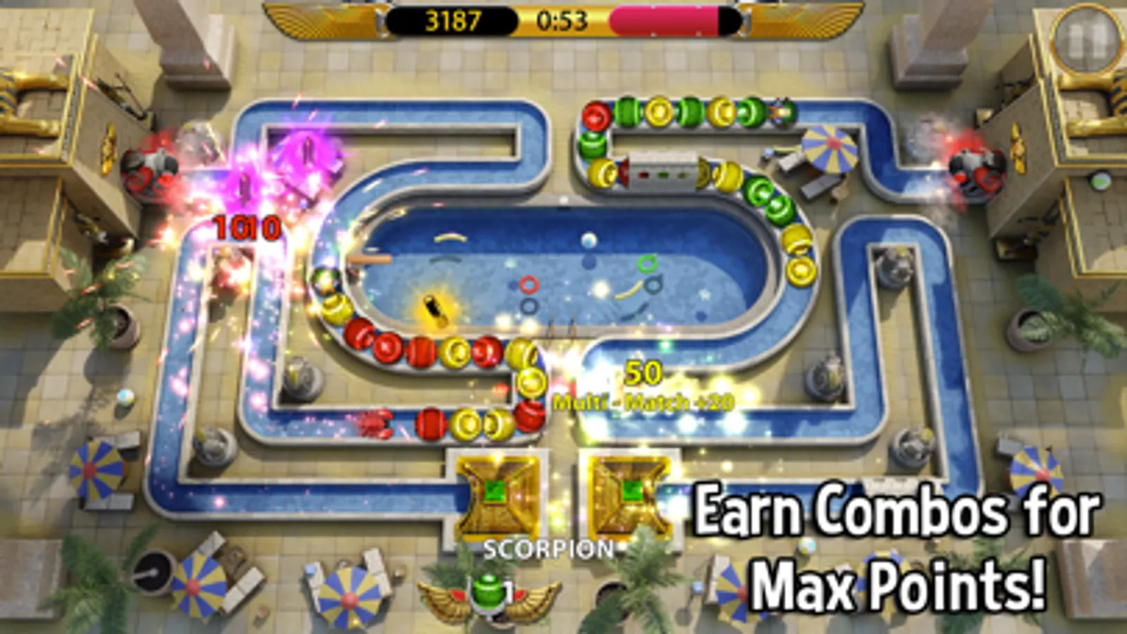 Shoot colored spheres from the mystical winged scarab to collapse the chain of spheres approaching the pyramids at the end of the paths.