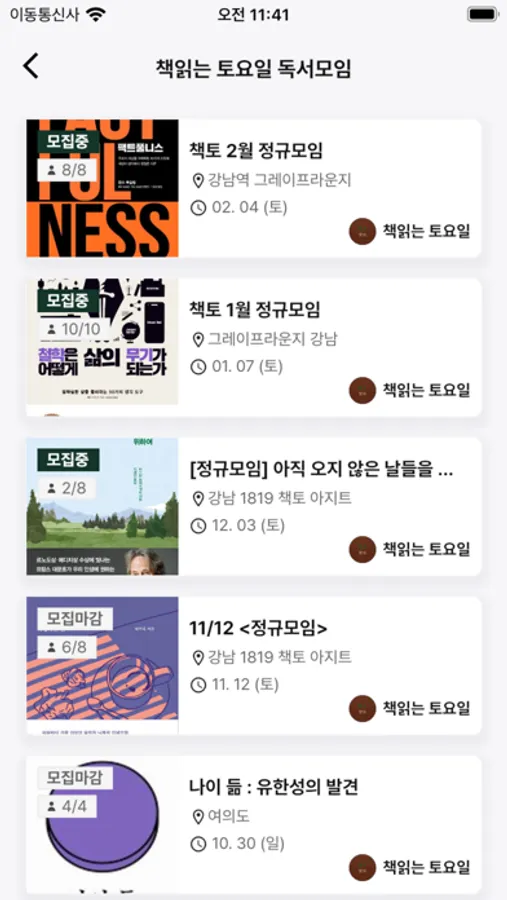 복잡했던 모임참여 및 모임 등록 절차를 시스템화하여 간편하게 독서모임 커뮤니티를 모바일앱에서 즐길 수 있습니다.
