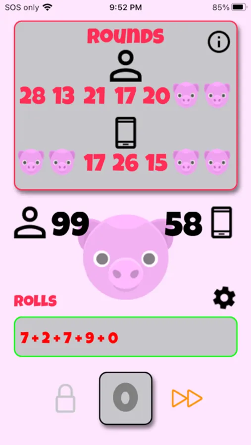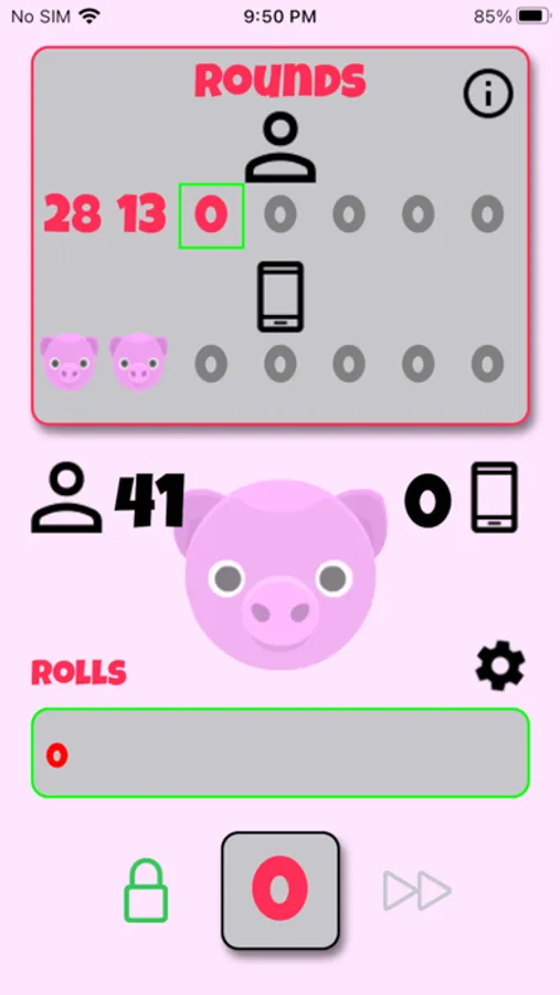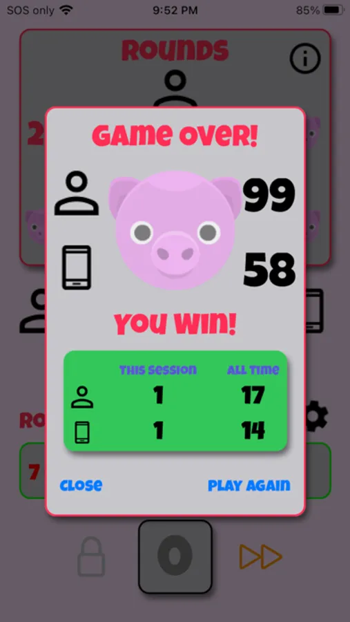 Play against your device over a 7 round tournament. Use each round to build your total score - but be careful, if you roll a 0 you're a greedy pig & you score nothing for that round. Choose a strategy to score big - it's not easy to beat your device!