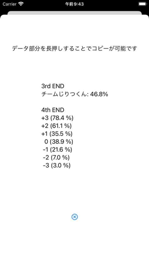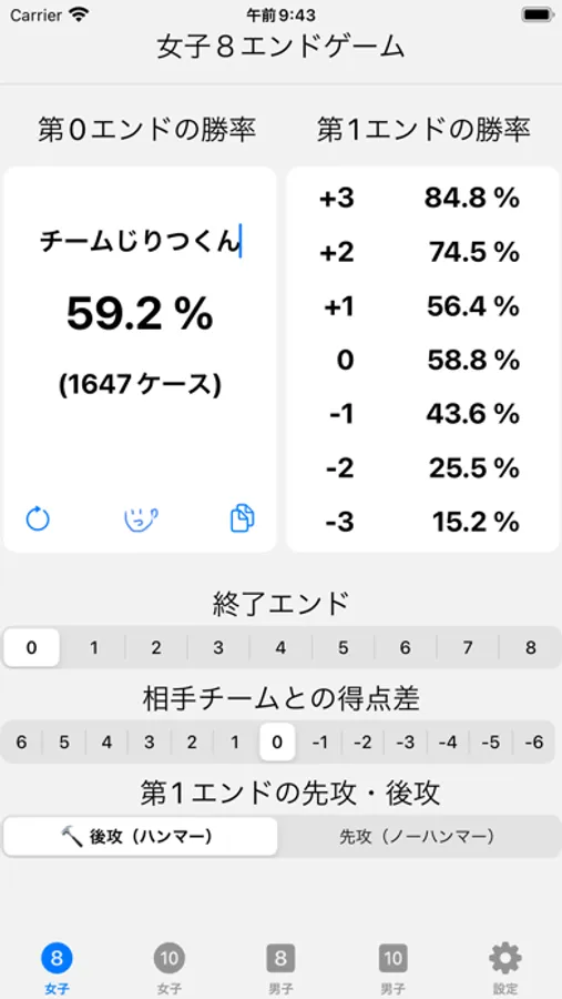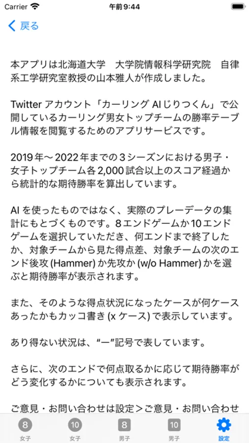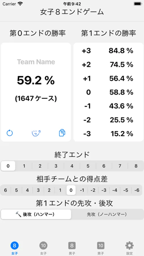 本アプリは、カーリングの試合途中での期待勝率を表示します。過去に行われたトップチームの試合を2,000試合以上の得点経過を分析して、残りエンド数と得点差、次のエンドの先攻・後攻の情報から実際にいくつの試合で勝ったのかにもとづいて、期待勝率を算出しています。