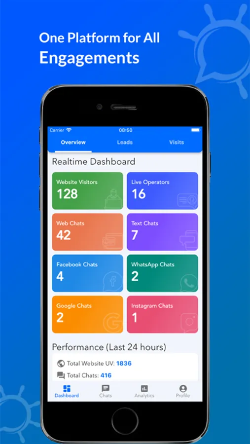All the lead features of the desktop and browser chat consoles have been built in. Auto capture of email addresses and phone numbers is included, as well as the ability to submit a lead into CRM, email, and SMS notifications.