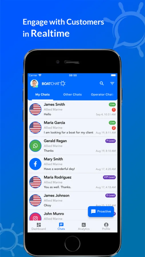The BoatChat Mobile App is compatible with iPhone 5S or newer and same generation iPod touch running iOS 10 or later, and offers the key functions of BoatChat’s desktop and web-based browser operator console. Pre-written responses, a comprehensive chat screen, and detailed lead info that is forwarded to dealer staff via CRM, email, or SMS. Hours of availability and visitor tracking, as well as comprehensive app statistics are available.