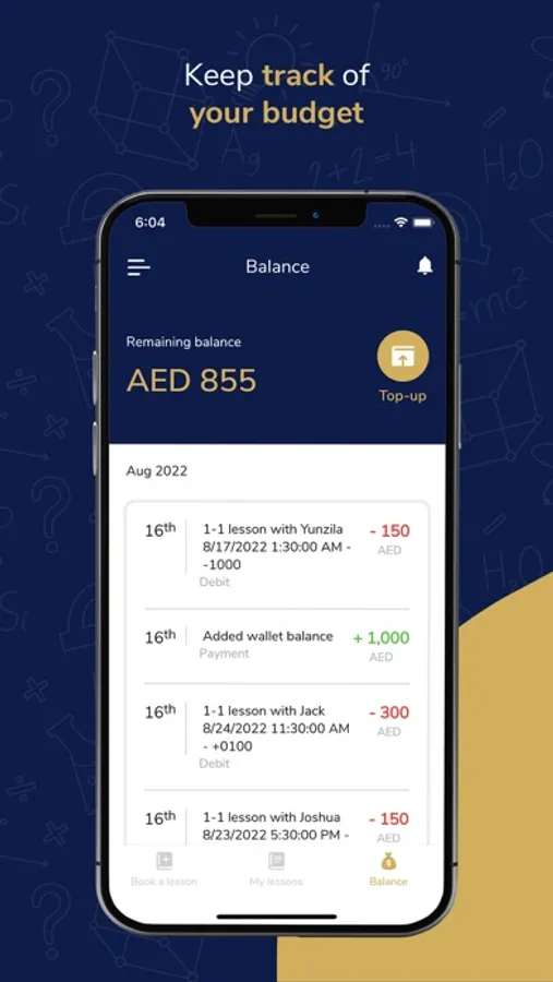 Balance screen: Keep on top of how your tutoring budget is being managed.
