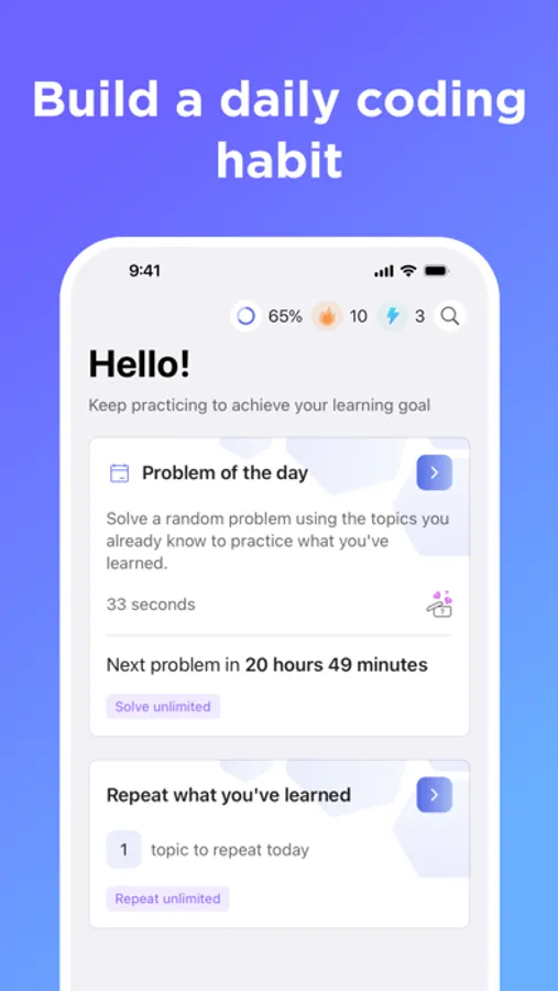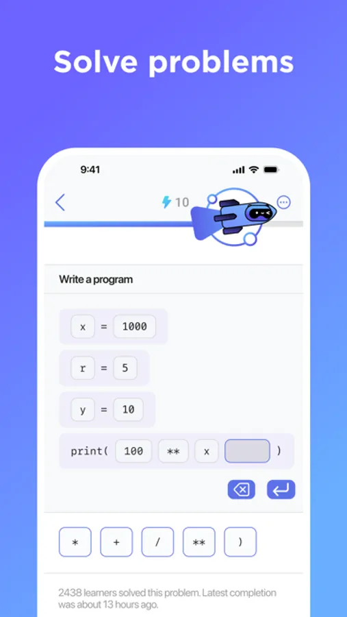 Looking for an app to learn Java, Python, Kotlin, JavaScript, Go, Data Science, SQL, Django, Spring and Scala? Hyperskill is your go-to solution! Our specialized courses are designed to take you from beginner to expert. With practical projects and hands-on learning, you'll master these languages and technologies in no time. Tackle today's challenges with our «Problem of the Day» and set your pace with adjustable daily reminders.
