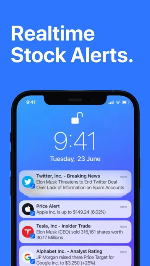 If you have activated the Breaking News Alert, Stocklet will send you a push notification as soon as a reputable news agency or newspaper, such as Bloomberg, CNBC, Forbes, The Wall Street Journal, Reuters, Financial Times and many more, publishes news about one of your stocks.