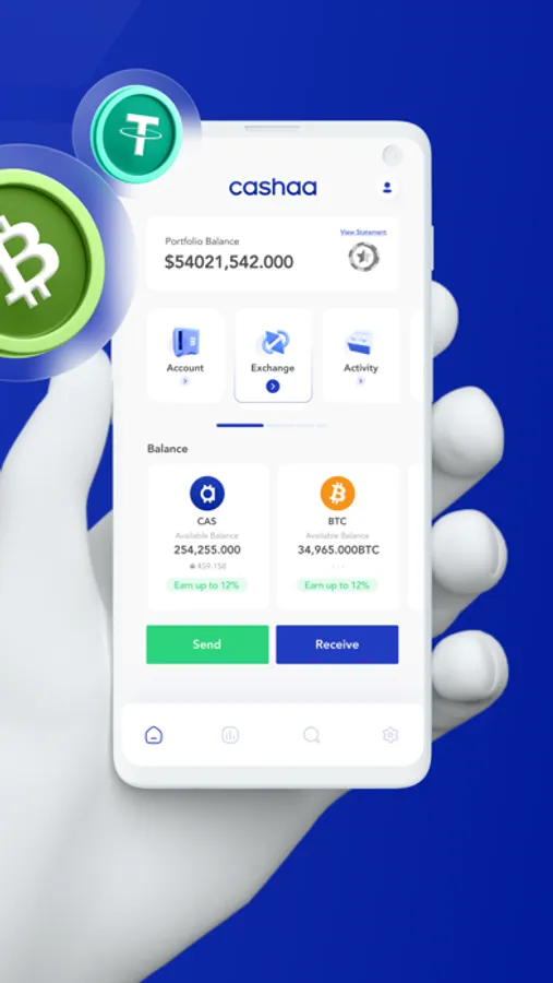 Invest in your favourite crypto currencies and stablecoins like Bitcoin (BTC), Ether (ETH), Binance Coin(BNB), Ripple (XRP), Tether (USDT), USD coin (USDC) and others with Fiat currencies like EUR and USD. Swap assets at the click of a button on the regulated and licensed Cashaa Exchange within the Cashaa Wallet app.