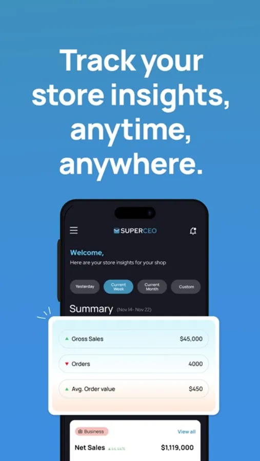SuperCEO is your personal data scientist that never sleeps. Get accurate Shopify store sales insights to track your venture’s growth from the total number of sales to the average order value on your mobile & email every day.