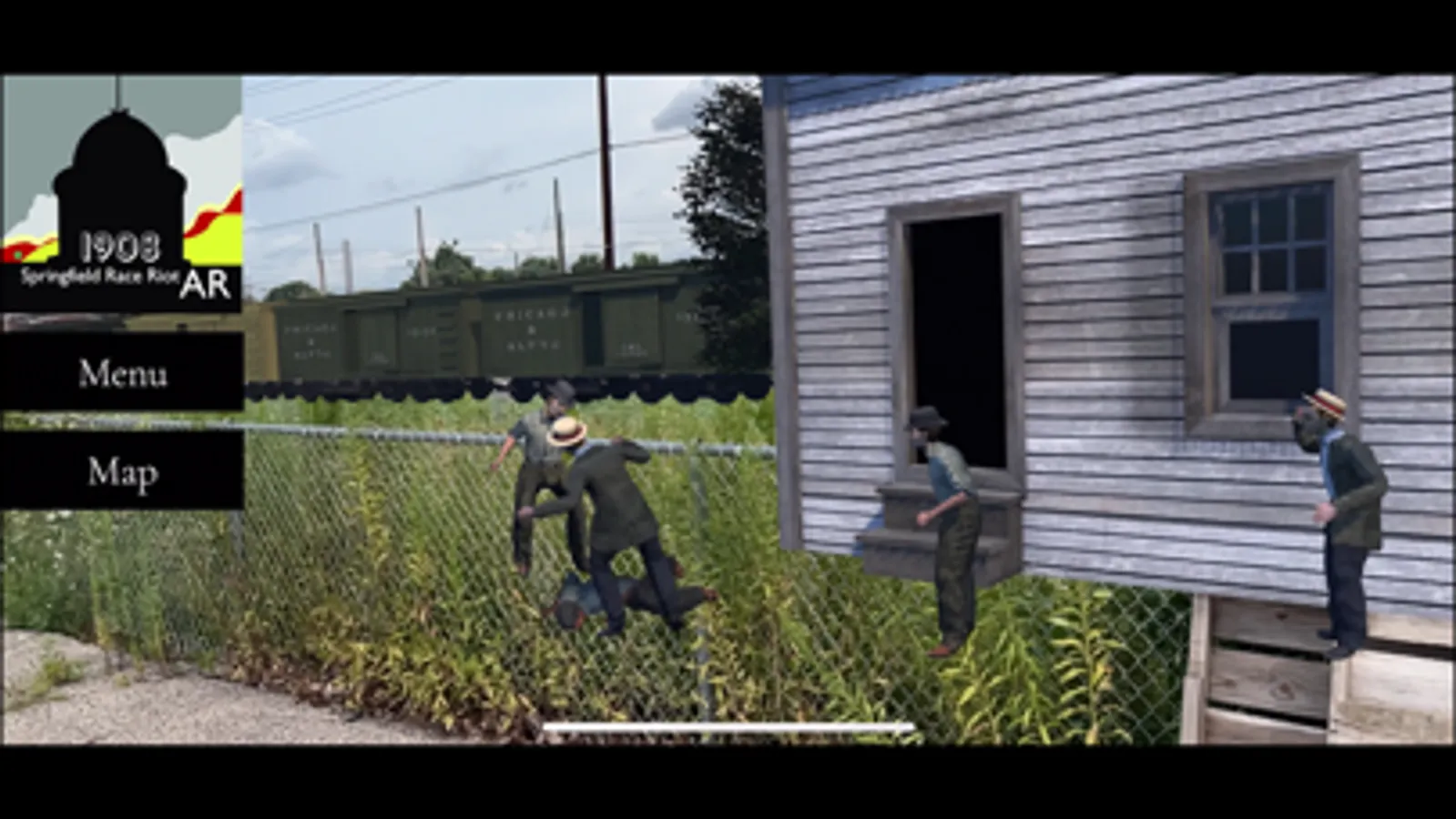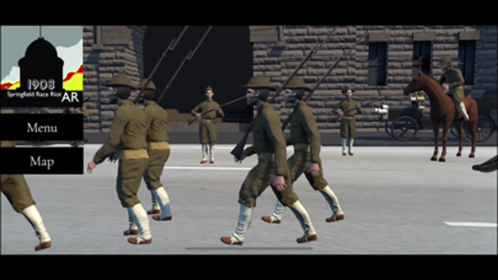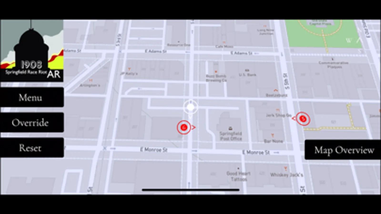 1908 Race Riot AR is an Augmented Reality-based mobile app that presents the 1908 Springfield, Illinois Race Riot, a horrific episode of racial violence perpetrated against African Americans in the Capitol of the State of Illinois which led to the founding of the NAACP. The app provides visitors with the ability to follow a self-guided tour of downtown Springfield, Illinois that presents the event and how it unfolded over three days. The app is centered around a GPS-based map that guides visitors to nine numbered AR stop locations. Each AR stop represents a place of significance where users are able to view animated AR recreations of events that took place. These animated AR recreations are viewed as overlays on the real present day landscape. The app was made possible by the US National Park Service’s Abraham Lincoln Home and the organization Looking for Lincoln.