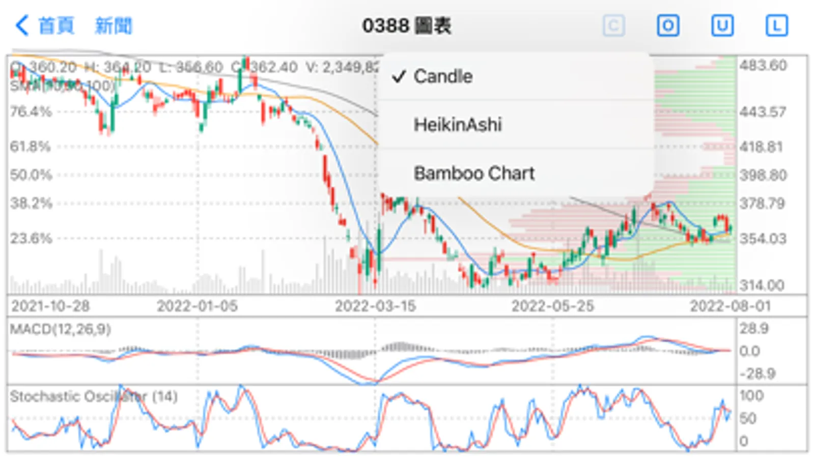2. 股票技術分析圖表: K線燭臺圖, 平均K線圖(Heikin-Ashi), 竹子圖三種。平均K線圖(Heikin-Ashi): 當條形顏色發生變化時, 趨勢反轉。竹子圖: 平頂或平底是反轉的標誌, 如果條形顏色發生變化, 則確認反轉。